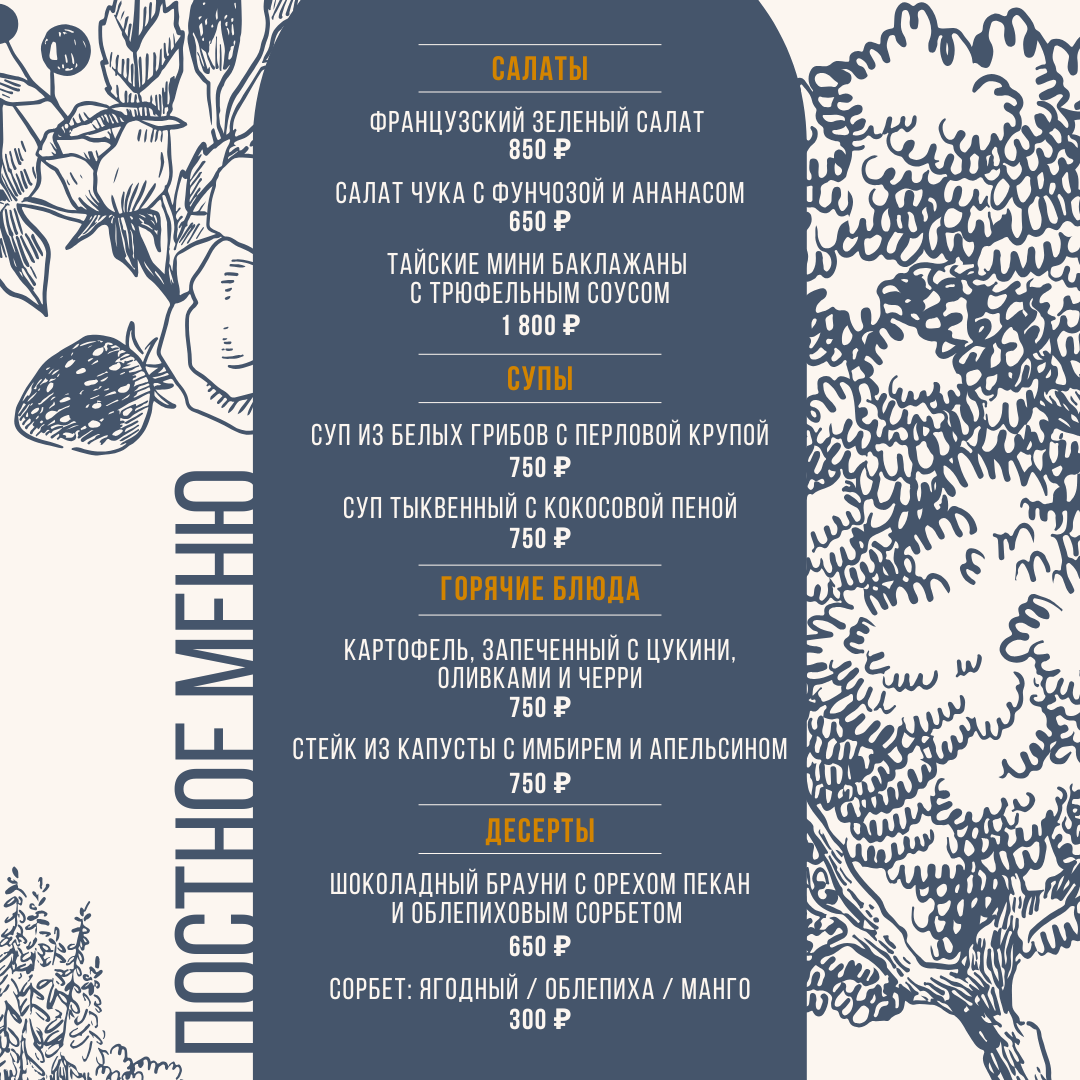 Мы переосмыслили традиции, создав блюда, которые сохраняют глубину вкуса и элегантность подачи, оставаясь при этом полностью постными. Это не компромисс, а новый взгляд на возможности растительных ингредиентов.