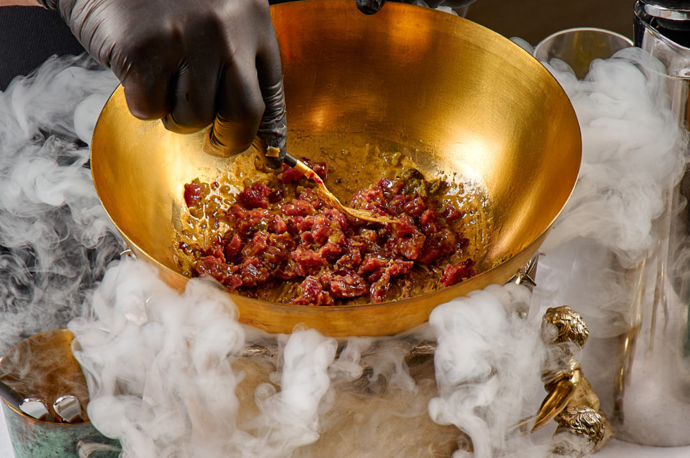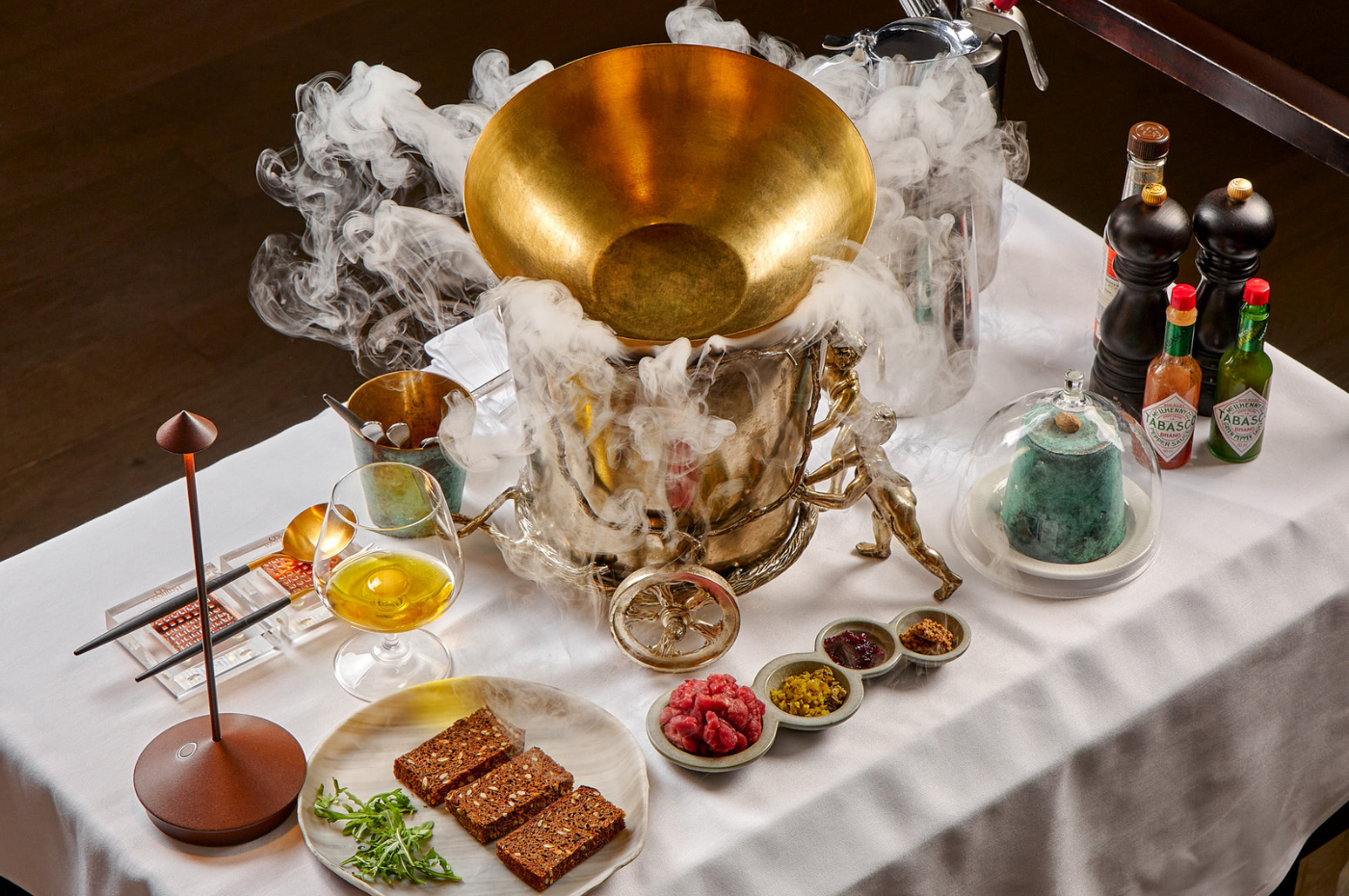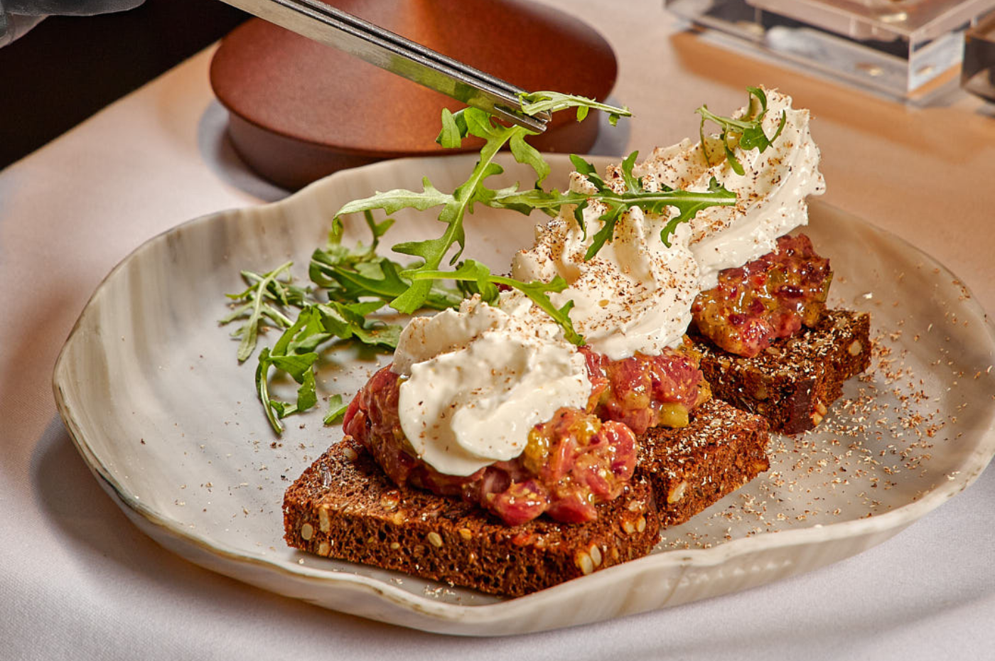 The foundation features crispy croutons from aromatic seeded bread. Upon them lies hand-chopped, succulent beef tenderloin, accented by the piquant notes of red onion, cornichons, and capers. Crowning the creation is a cloud of the most delicate Parmesan mousse, while a dusting of grated nutmeg adds a final layer of warm, aromatic depth.