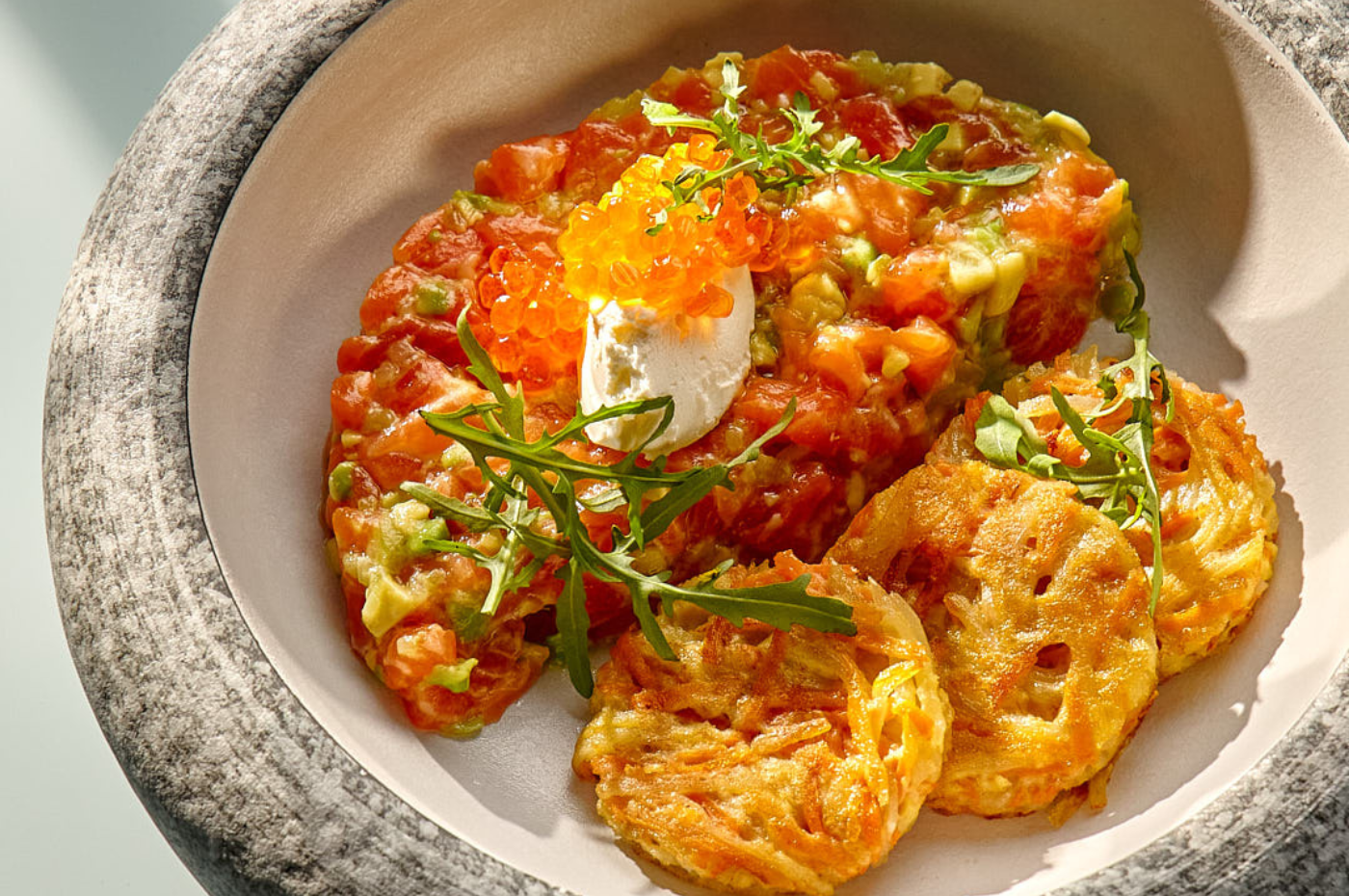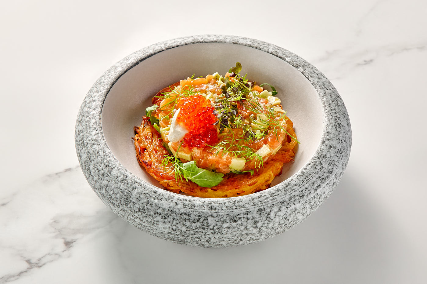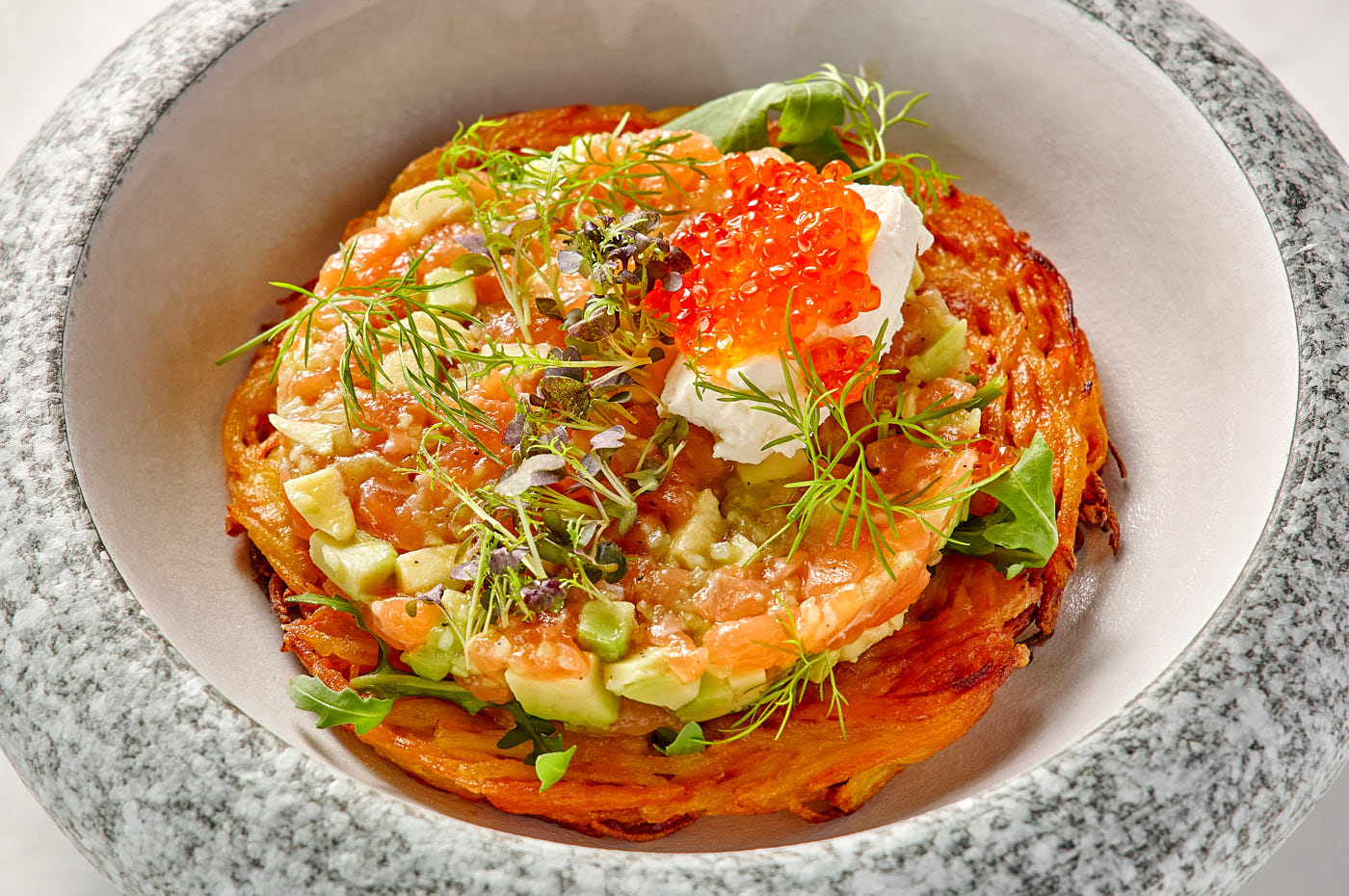 A refined harmony of textures and tastes. Featuring the finest salmon tartare with avocado and crunchy cucumber, served on a golden sweet potato and potato pancake. Accented with hints of citrus sauce and the light creaminess of mascarpone to complete the symphony of flavors.