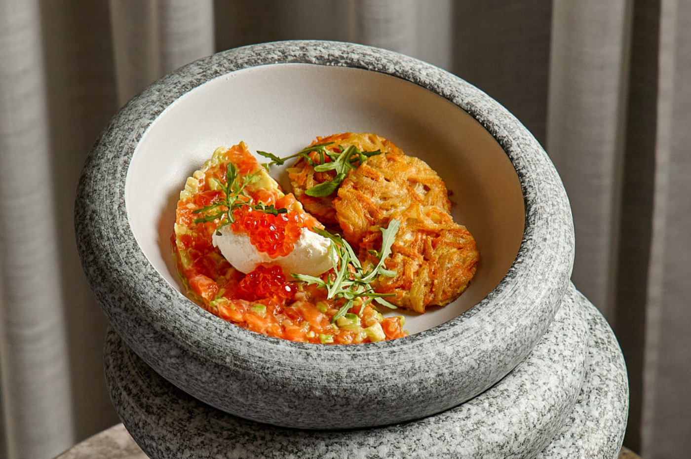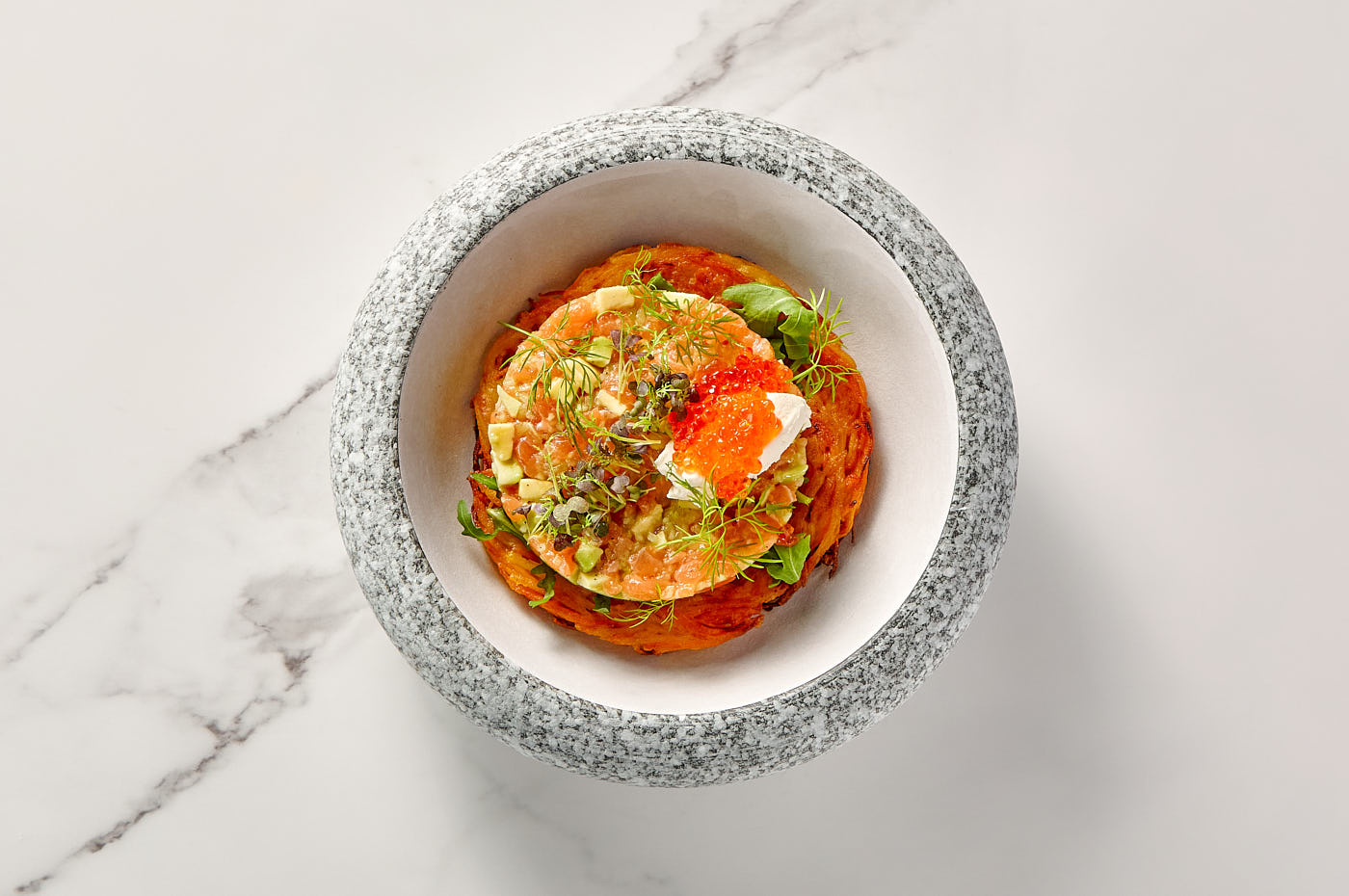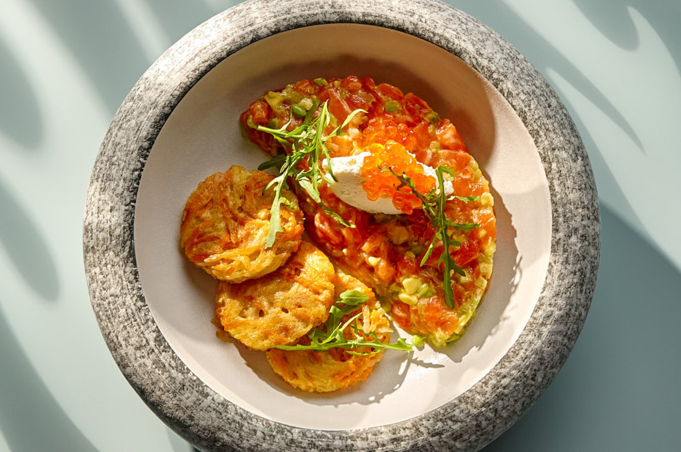 A refined harmony of textures and tastes. Featuring the finest salmon tartare with avocado and crunchy cucumber, served on a golden sweet potato and potato pancake. Accented with hints of citrus sauce and the light creaminess of mascarpone to complete the symphony of flavors.