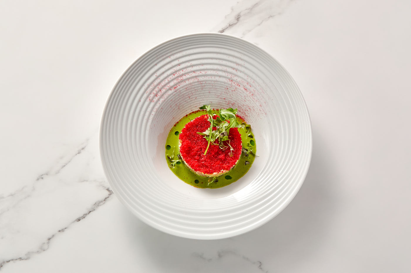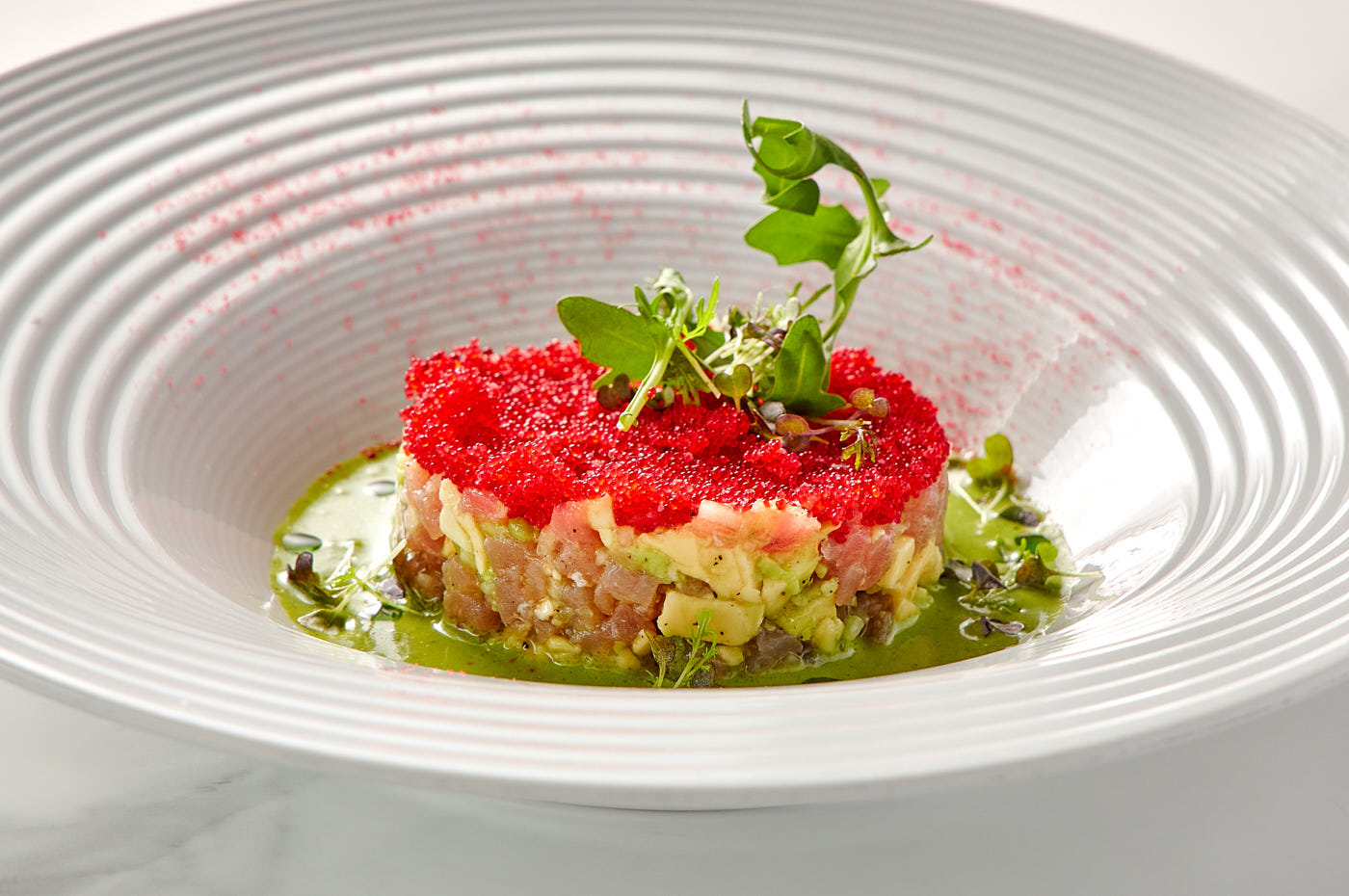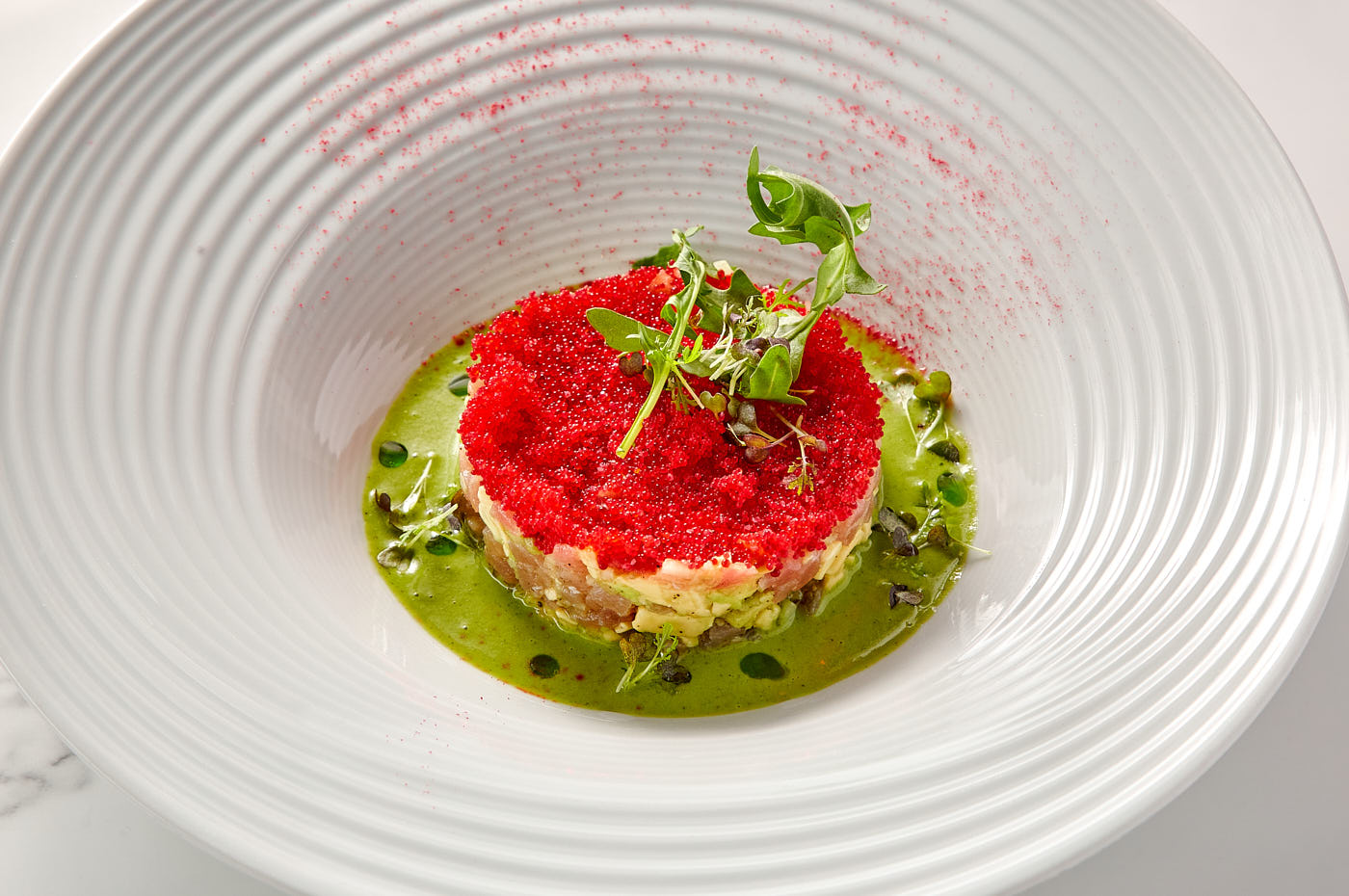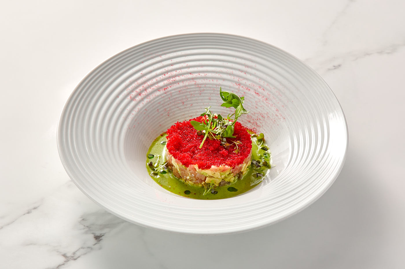 A refined balance of tender and fresh. Yellowfin tuna, avocado, and crisp cucumber, complemented by a light cucumber mousse with notes of mint, lime, and coconut. Finished with crunchy tobiko for a delicate and sophisticated dish.