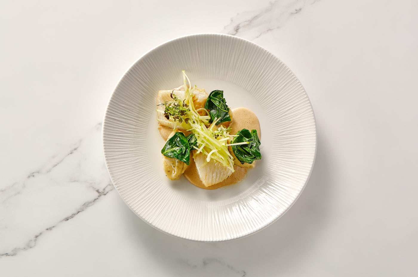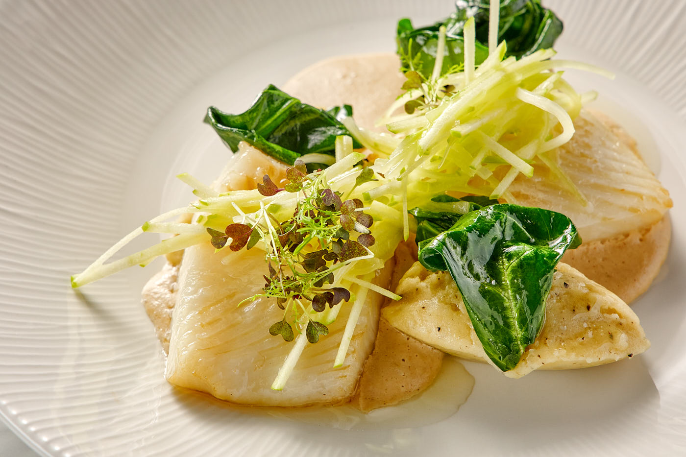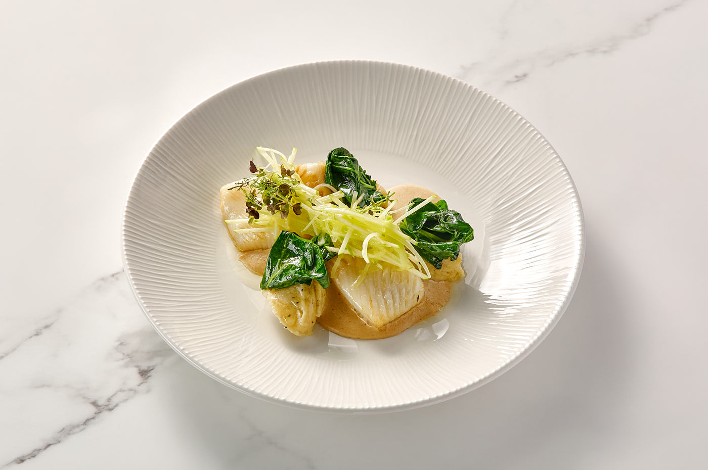 The firm fillet of blue-skinned halibut, steamed to preserve its pure taste and succulence. Served on creamy truffle-infused mashed potatoes, surrounded by tender sautéed spinach, crisp celery, and fresh apple.