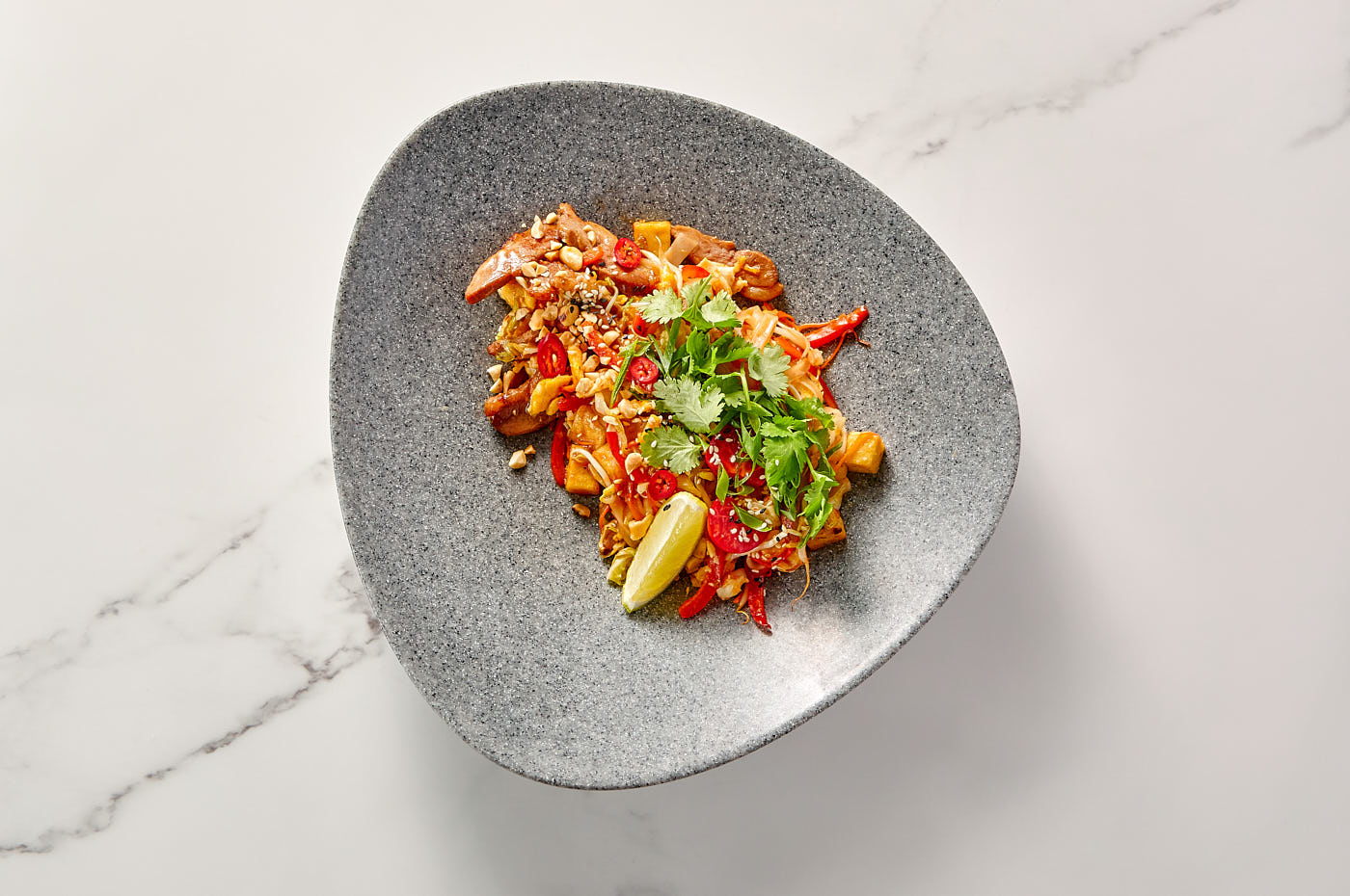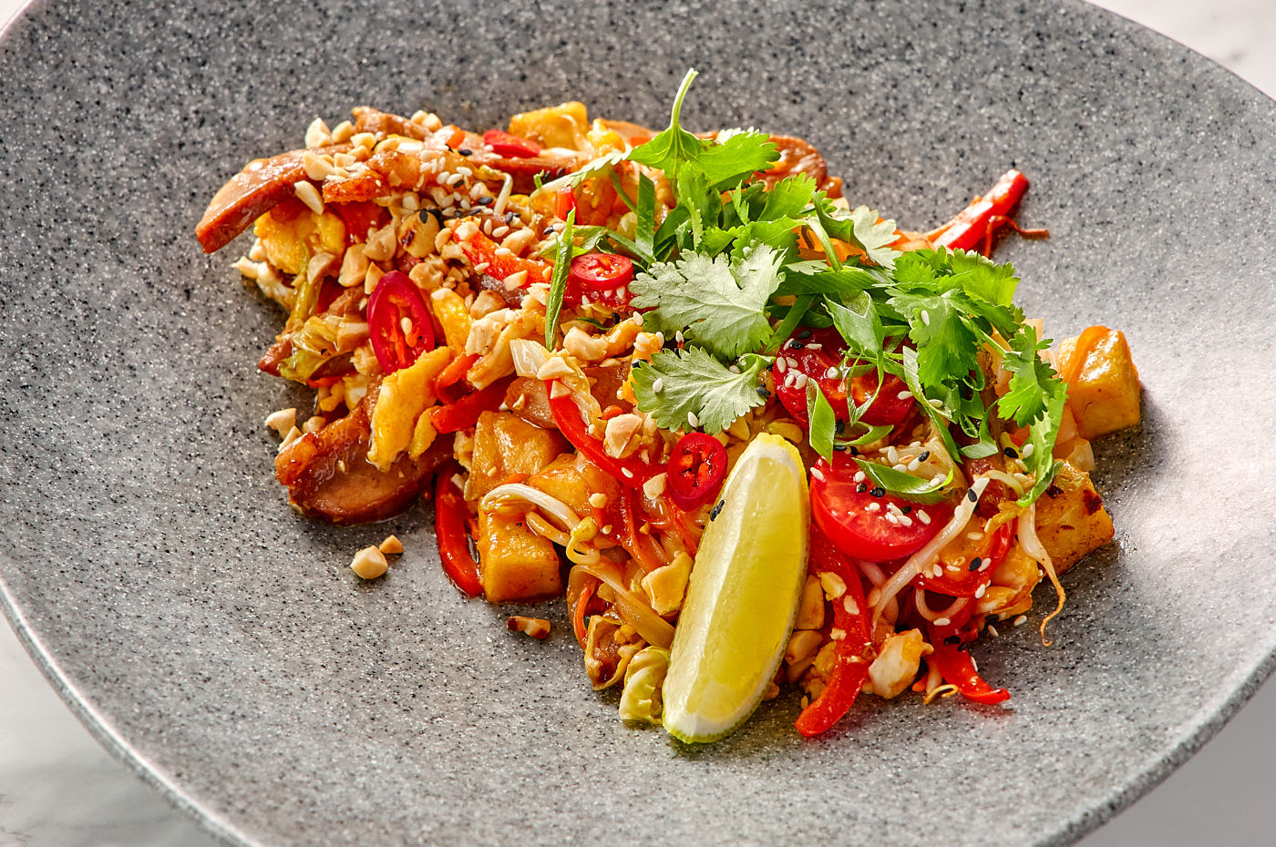 Изысканная версия классического тайского блюда, где нежное мясо утиной грудки с хрустящей кожицей заменяет традиционные морепродукты. Утка обжаривается воке с рисовой лапшой, свежими овощами и яйцом, а затем заправляется аутентичным соусом Пад Тай на основе тамаринда. Подается с ломтиками лайма, рубленым арахисом и кунжутом для контраста текстур и вкусов.