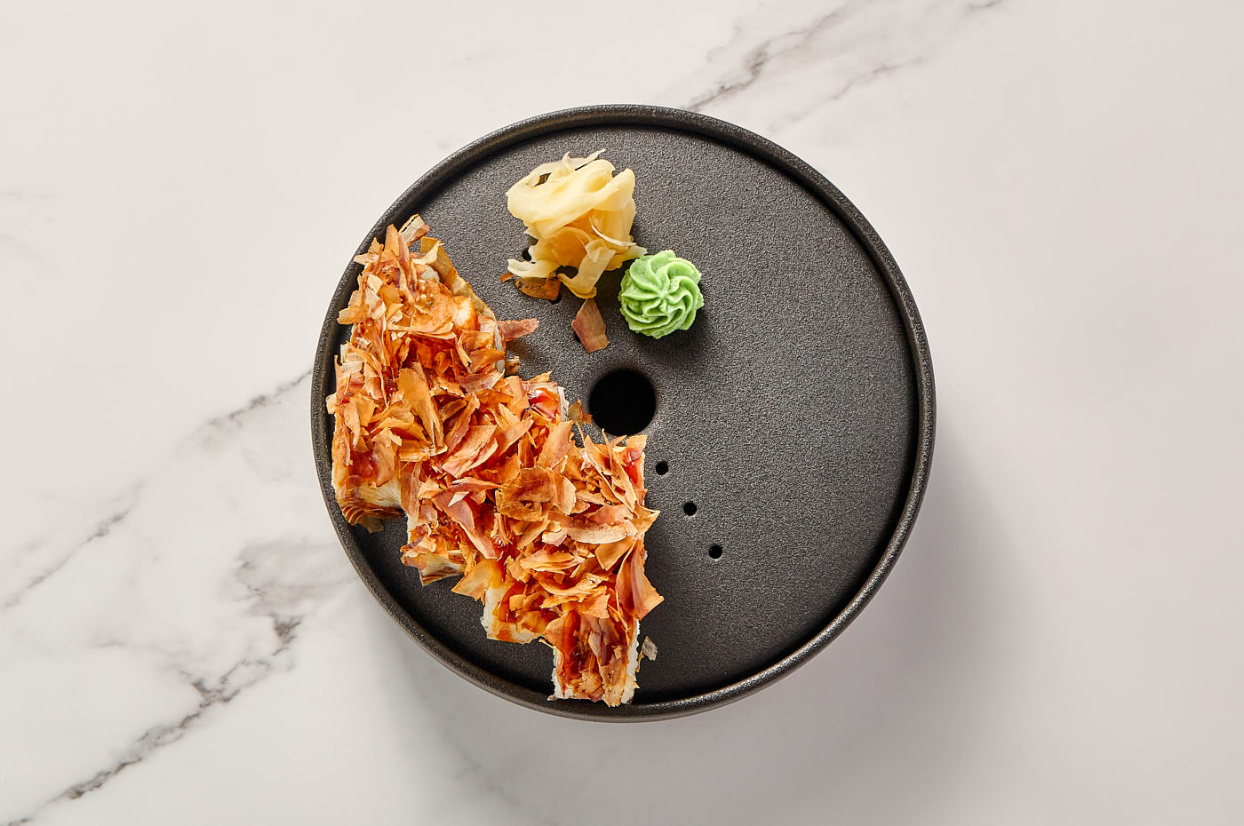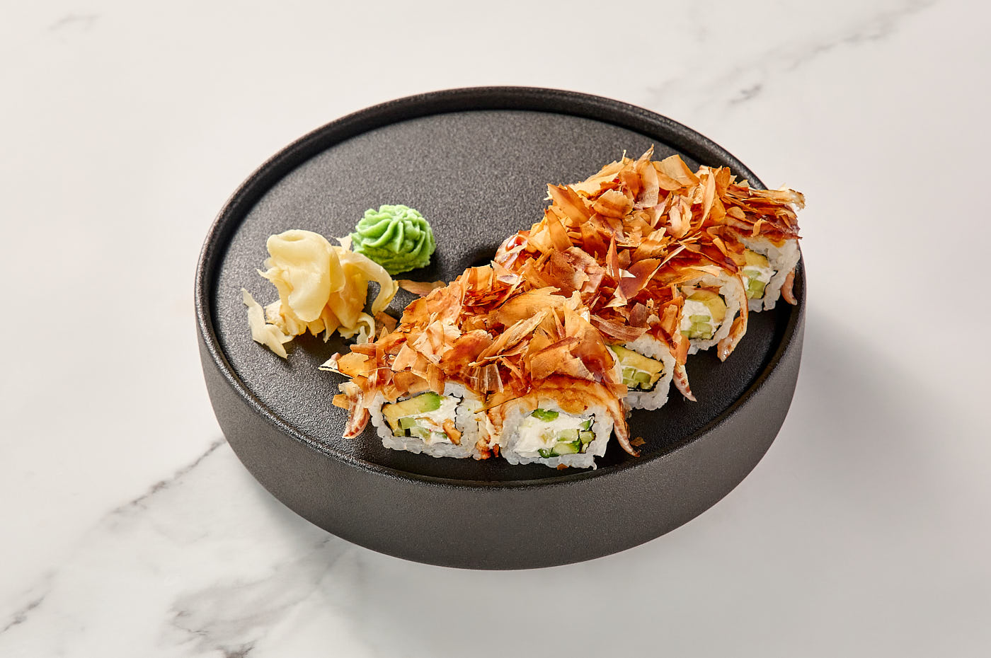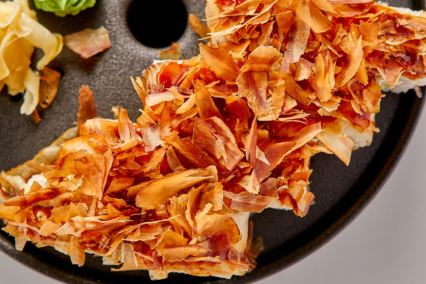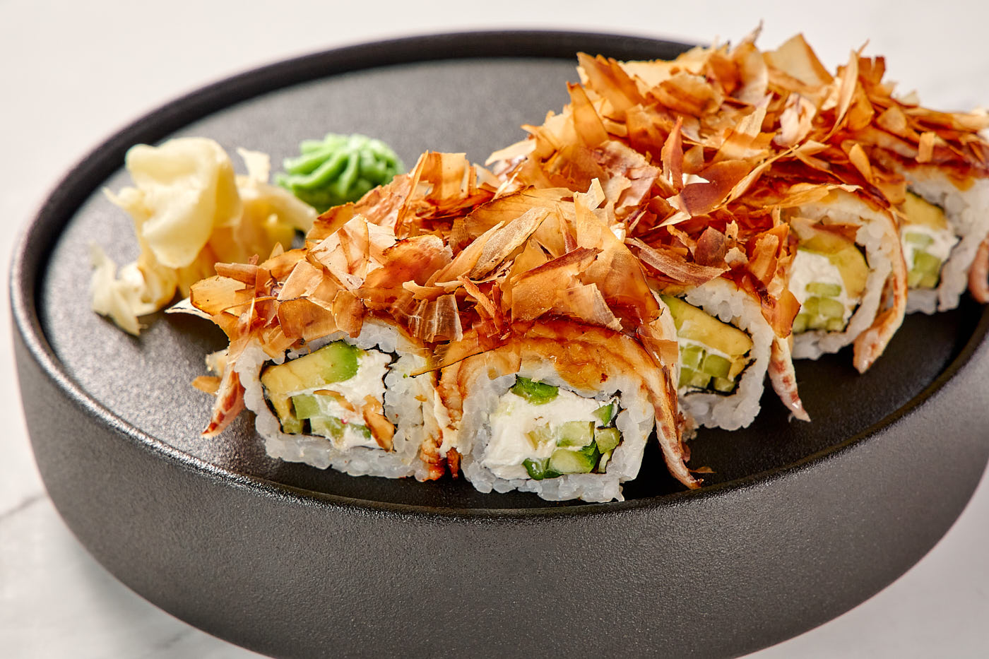 For this roll, we use tender smoked eel, creamy avocado, fresh cucumber, and rice cooked using a special technique. It is complemented with cream cheese, crunchy tobiko, and unagi sauce, finishing with aromatic bonito flakes.