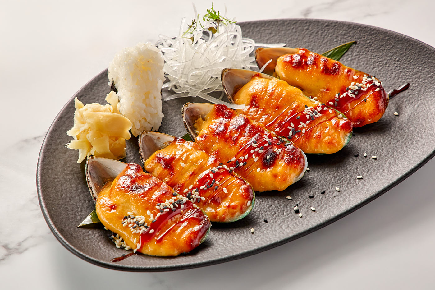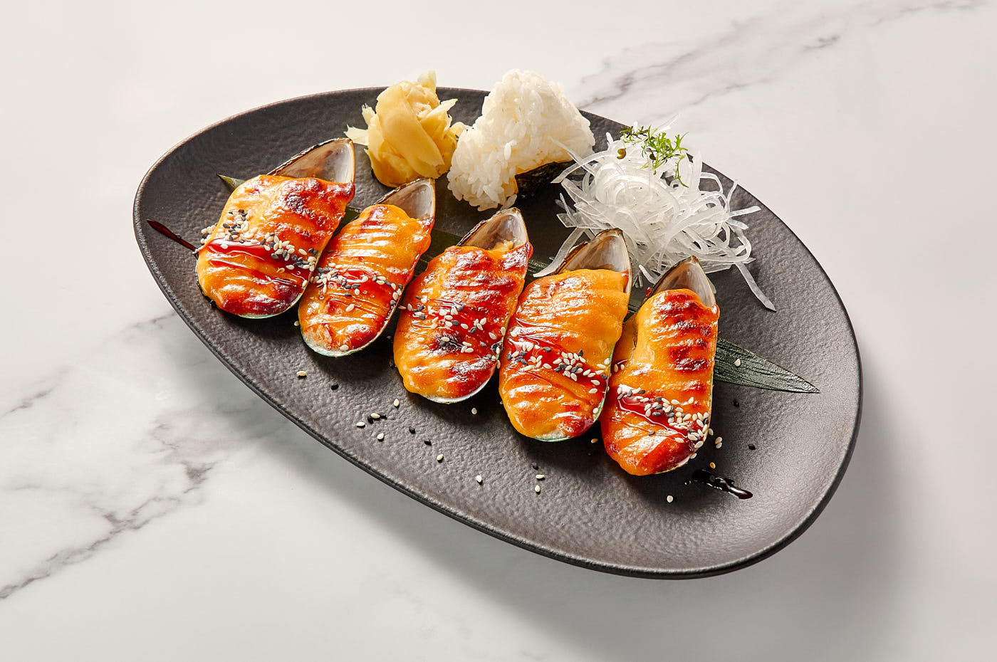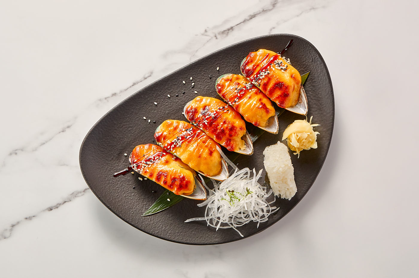 Нежные мидии запекаются под насыщенным острым соусом спайси, приготовленным на основе домашнего майонеза, кимчи и соуса табаджан, сервируем с онигири для баланса остроты.