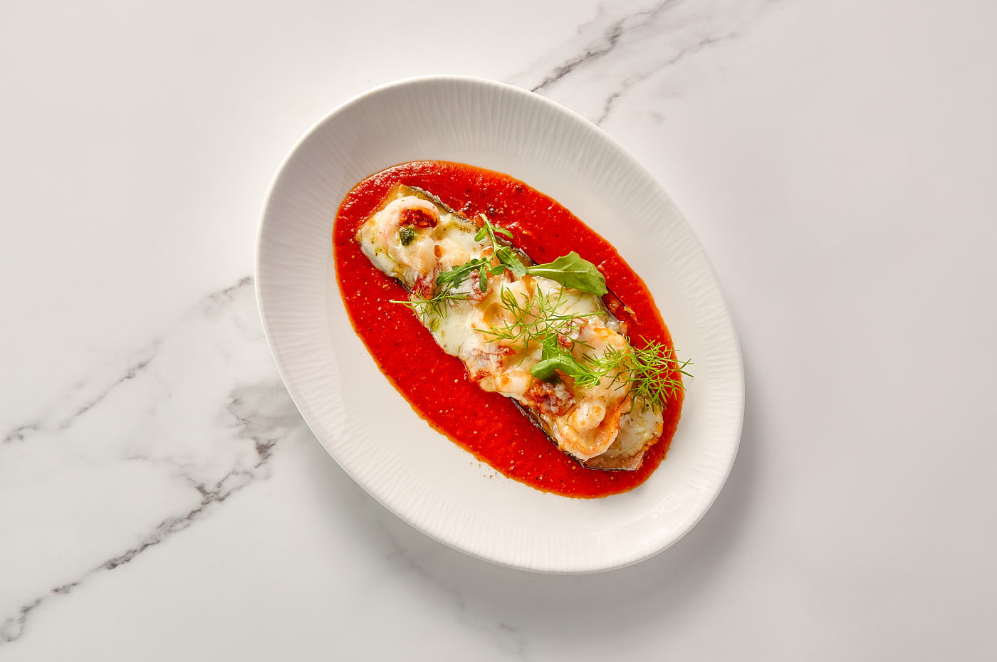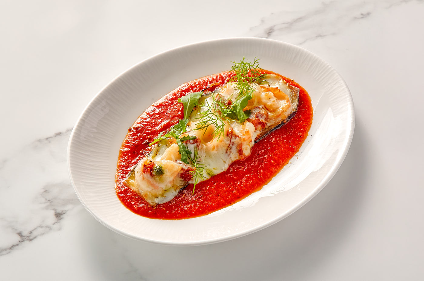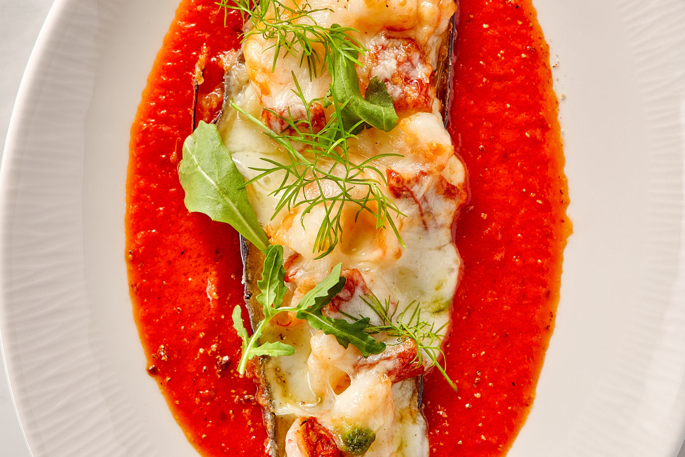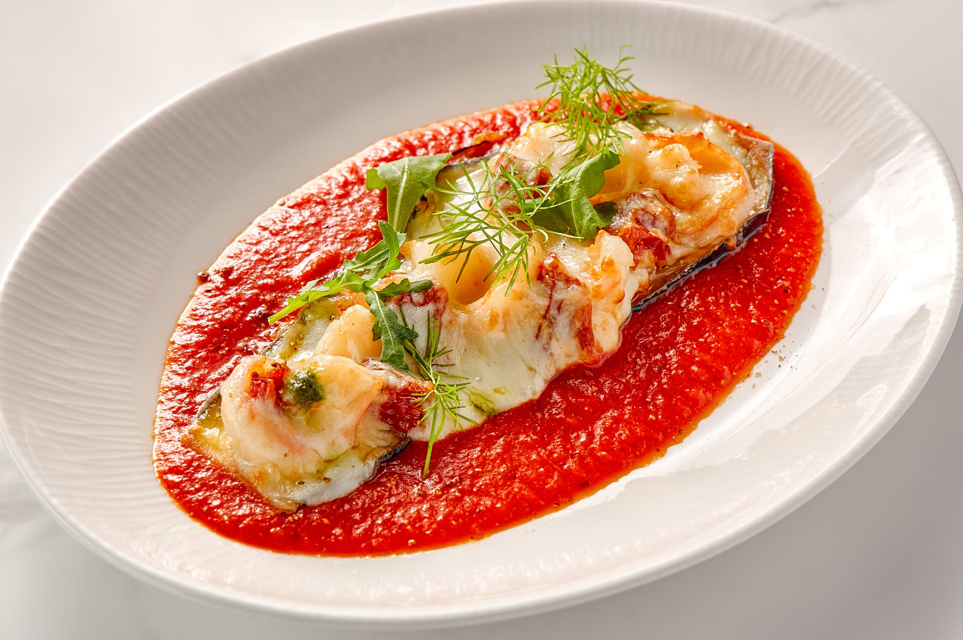 The Essence of Italy in Every Bite. Layers of delicate eggplant, noble prawns, and oozing cheese baked to perfection. Enhanced by a piquant sauce of ripe tomatoes and roasted peppers.