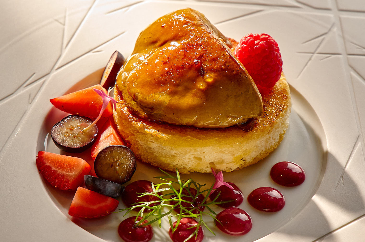Калининградская фуа-гра не уступает французской по качеству. Ломтик с золотистой корочкой и кремовой сердцевиной подаётся с поджаренным крутоном, кисло-сладким брусничным соусом и свежими ягодами, создавая идеальный баланс вкусов и текстур.